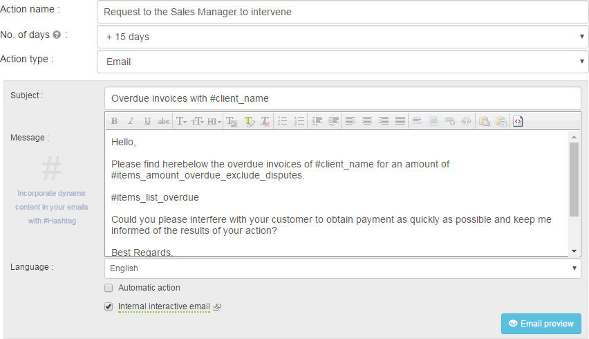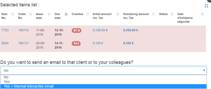 - The emails of collection scenarios can also be internal interactive, for example in the case of a request to a sales manager to intervene.
